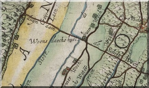 van de tak van drie Jannen van de Boekhorst dat stamt uit de 14e eeuw. De route is dus eigenlijk "pas" van 1657, en we komen ongeveer uit bij de quakel die links op het kaartje staat aangegeven. Dat was ook een brug, die zwierige bochten waarmee de weg thans het water passeert waren er vroeger natuurlijk niet, je ging eerst een klein stukje rechtsaf en dan weer links en kwam op de Laege Wech uit. |