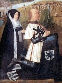 Links Jan (III) van de Boekhorst en zijn vrouw Lijsbeth van Alkemade, afgebeeld op hun grafzerk in de Jeroenskerk in Noordwijk. Zij overleden in resp. 1450 en 1479. Hieronder nog een detail van de grafzerk van Jan en Lijsbeth. Rechts hun zoon Daniël (die zich van Noirtich noemde) en zijn vrouw Agnes van Raephorst. Daniël overleed in 1466. De afbeelding is, net als twee andere op deze pagina, een uitsnede uit een schilderij van J. Mostaert (zie ook Wapens). |