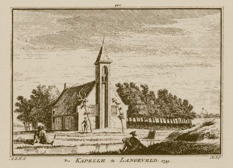 zuid-noord en dood. Die volgende dwarsverbinding is de Langevelderlaen die in Noordwijk nu ook nog zo heet, maar dan met "laan"gespeld. We gaan daar ook weer rechtsaf en oostwaarts, maar niet na eerst gewezen te hebben op de locatie waar vroeger de kapel van het Langeveld heeft gestaan: aan de duinzijde van de Randweg, waar Camping Jan de Wit ook al niet meer zo heet. Links een ets uit 1729 waarop een afbeelding van de kapel, die vanaf begin 14e eeuw tot het midden van de 19e eeuw heeft bestaan. |